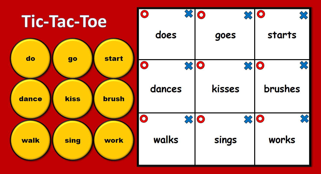 + Requirements: Divide the class into two teams. One is placing X and one is placing O. Let Ss play “Rocks, papers, scissors” to decide who is playing first. Ss pick one verb and are asked to check its ending sound which is pronounced into /z/, /iz/ or /s/, and then answer. Which team has 3 of their marks in a row (up, down, across, or diagonally) is the winner.