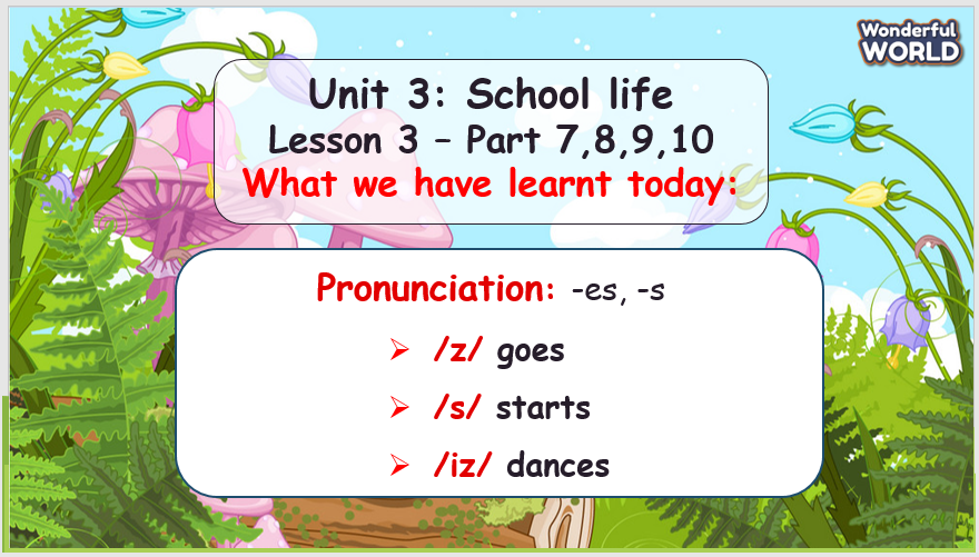 - Let Ss listen to these words ending in /-s/ or /-es/ and ask them to focus on how to pronounce the ending sound of each word. T concludes that there are three ways of pronouncing the ending sounds of /-s/ and /-es/.