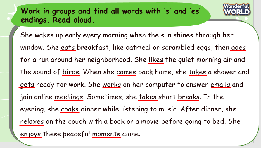 - Work in groups and find all words with ‘s’ and ‘es’ endings. Read aloud