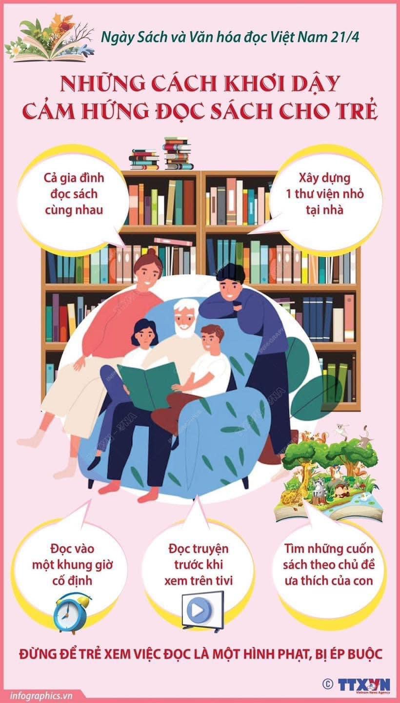 Ngày Sách và Văn hóa đọc Việt Nam được tổ chức vào ngày 21/4 hằng năm nhằm khẳng định vị trí, vai trò và tầm quan trọng của sách đối với việc nâng cao kiến thức, kỹ năng, phát triển tư duy, giáo dục và rèn luyện nhân cách con người; khuyến khích và phát triển phong trào đọc sách trong cộng đồng, tạo dựng môi trường đọc thuận lợi; hình thành thói quen đọc sách trong gia đình, trường học, cơ quan, tổ chức; góp phần xây dựng xã hội học tập. Chủ đề Ngày Sách và Văn hóa đọc Việt Nam năm 2024 là: “Sách hay cần bạn đọc”, “Sách quý tặng bạn”, thể hiện rõ tầm quan trọng của việc phát triển văn hóa đọc trong thời đại hiện nay. Để khơi dậy cảm hứng đọc sách cho trẻ, bố mẹ cần tìm những cuốn sách theo chủ đề ưa thích của con, đọc vào một khung giờ cố định, Xây dựng một thư viện nhỏ tại nhà…