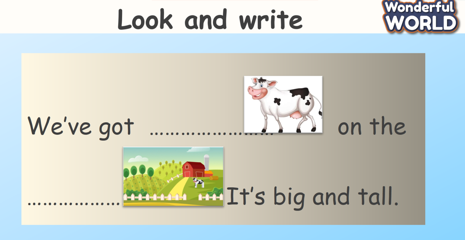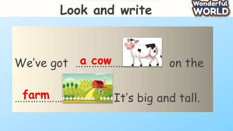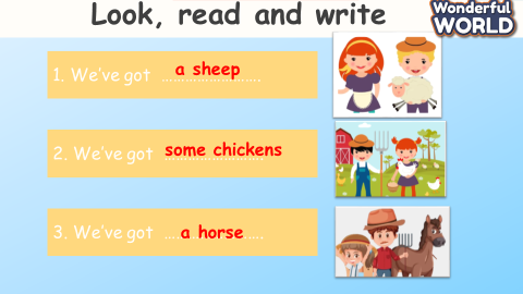 Keys: 1. We’ve got some goats. 2. We’ve got a cow. 3. We’ve got a dog. 4. We’ve got a fish. 5. We’ve got two rabbits.
