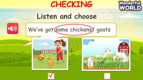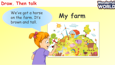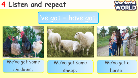 b. Procedure Set a text: T says that T will take the class to the farm of some children and ask them to guess what animals there are on the farm. T shows the pictures of two children and listens to what they say. Focus on the structure: “ We’ve got…….” Or explain the structure in Vietnamese. 4 Listen and Repeat Tell students to open their books on page 31 and look at the pictures. Point to the first picture word. Say the word and ask students to repeat it. Do the same with all the structures. Play the recording for the students to listen to, and repeat the sentences. Read all the words again one by one and ask students to repeat them afterward. Remind them about the abbreviation: Checking Let Sts listen and choose the picture to check their understanding. If Ss can answer, give them the dice to roll and get stars.