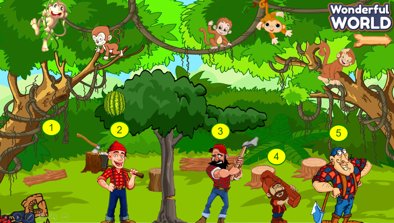 Rule: With each correct answer, click the monkey to drop the fruits and protect the jungle.